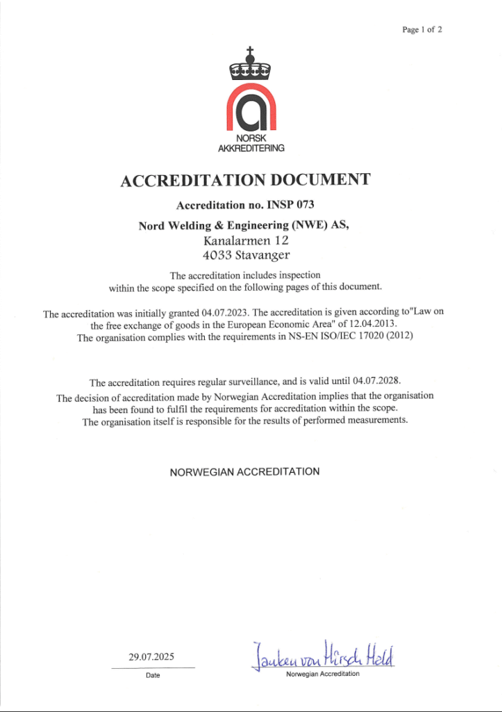 Nord Welding & Engineering AS is accredited under ISO/IEC 17020:2012, confirming our competence as an independent inspection body for conformity assessments.